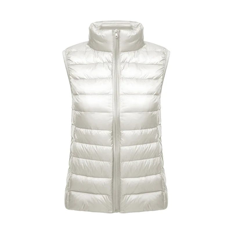 Elevate your winter wardrobe with this elegant and practical white sleeveless down vest that combines warmth, style, and comfort effortlessly.